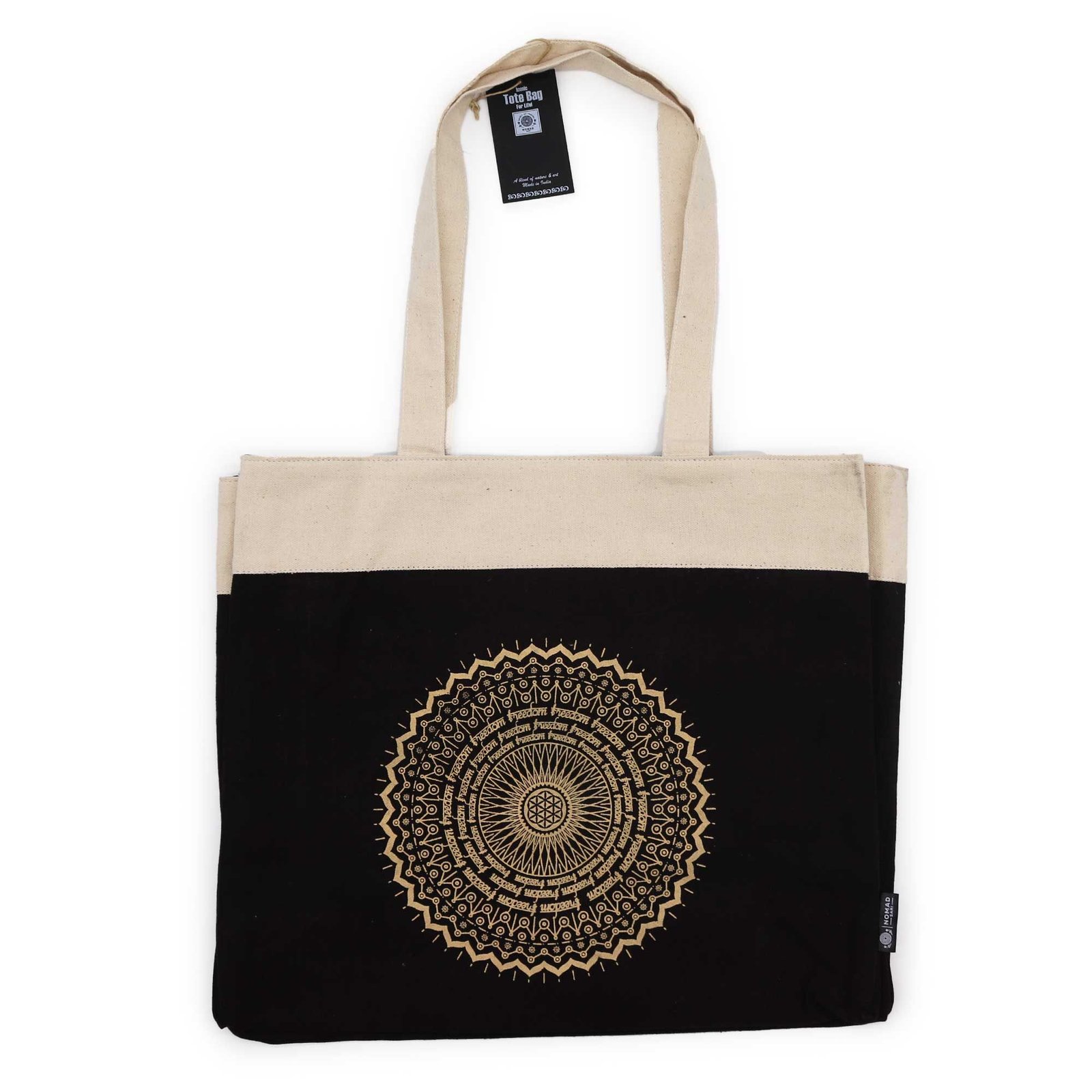 Esta espaciosa bolsa tote presenta un detallado estampado de Rueda Mandala en dorado, inspirado en el arte sánscrito tradicional. El mandala es un símbolo geométrico sagrado encontrado en diversas culturas, que representa totalidad, continuidad y la naturaleza cíclica de la vida. En tradiciones espirituales, se utiliza como ayuda para la meditación para centrar la mente y encontrar paz.